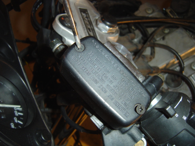 Une fois le flanc déposé ouvrir le couvercle du réservoir du liquide d'embrayage (je vous conseille de ne pas le faire avant car pendant la dépose du flanc de carénage vous risquez de voir du liquide sortir du réservoir suite à un mauvais geste et comme le produit est corrosif, attention à la peinture de votre monture)