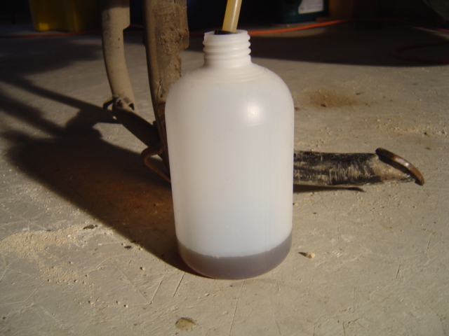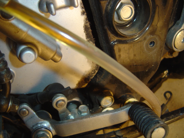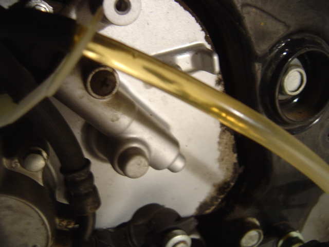 A l'aide de votre clé de 10 plate desserrez le robinet de purge et appuyez sur la poignée d'embrayage. ATTENTION car si vous n'avez pas de flexible équipé d'un clapet anti-retour refermez le robinet de purge avant d'être en butée, car vous risquez de faire renter de l'air à l'intérieur du circuit. Pour le début de la manip ce n'est pas bien grave, mais autant prendre le bon coup de suite car cela vous évitera à la fin de purger plus qu'il ne faut. Alors pensez à refermer le robinet avant la butée. Si comme moi vous êtes équipé du flexible avec le clapet aucun risque : vous ouvrez le robinet et vous pompez sur le levier d'embrayage. Au début vous allez voir sortir du liquide bien foncé :