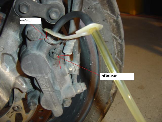 Une petit astuce : si vous n'avez pas le clapet, remplissez déjà le fond du bidon avec du liquide afin que le bout de flexible soit bien noyé dans le liquide. Cela vous évitera des remontés d'air. Sinon pour ceux qui comme moi ont le clapet pas de souci, pompez lentement sur le levier de freins et vous allez voir sortir du bon vieux liquide de freins foncé et pas la peine de refermer le robinet car le clapet vous évite les remontées d'air. Vérifier souvent le niveau de liquide dans le réservoir et le remplir avant que le niveau ne soit trop bas.