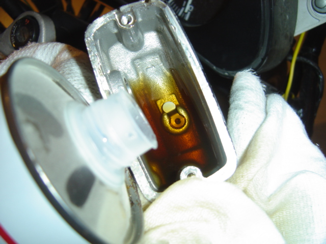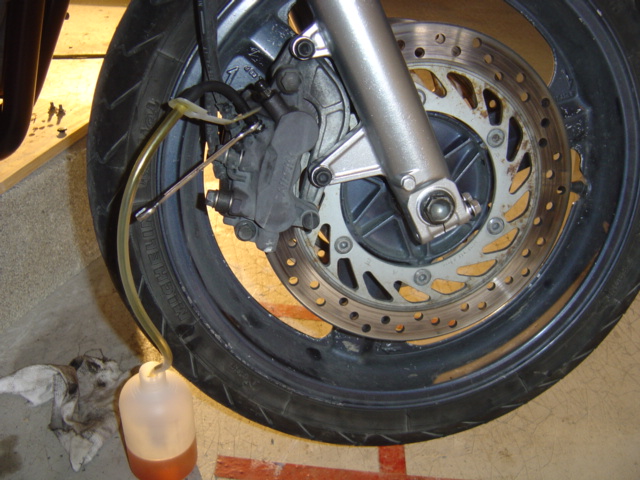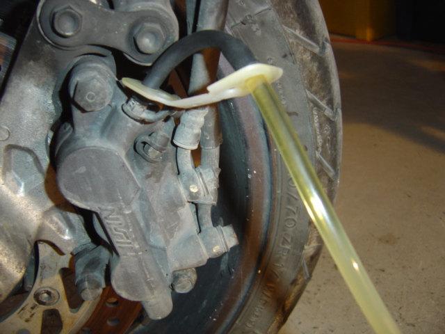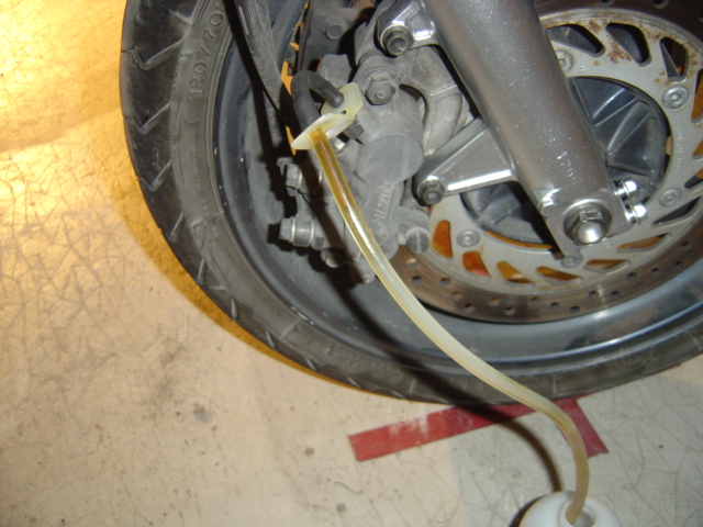 Une petit astuce : si vous n'avez pas le clapet, remplissez déjà le fond du bidon avec du liquide afin que le bout de flexible soit bien noyé dans le liquide, cela vous évitera des remontés d'air. Sinon pour ceux qui comme moi ont le clapet pas de souci : pompez lentement sur le levier de freins et vous allez voir sortir du bon vieux liquide de freins foncé et pas la peine de refermer le robinet car le clapet vous évite les remontées d'air.