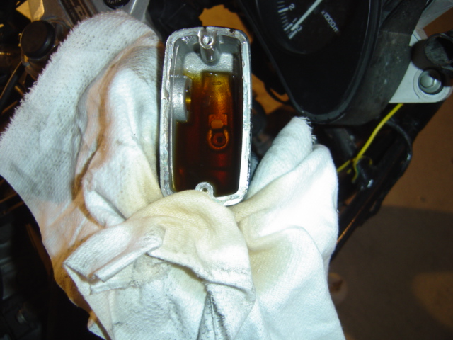 Ouvrez votre couvercle de réservoir de liquide de freins et disposez autour un chiffon pour éviter tout risque de projections de liquide de freins, car comme celui-ci est très corrosif attention à la peinture de votre monture. Remplir le réservoir au maximum de liquide :