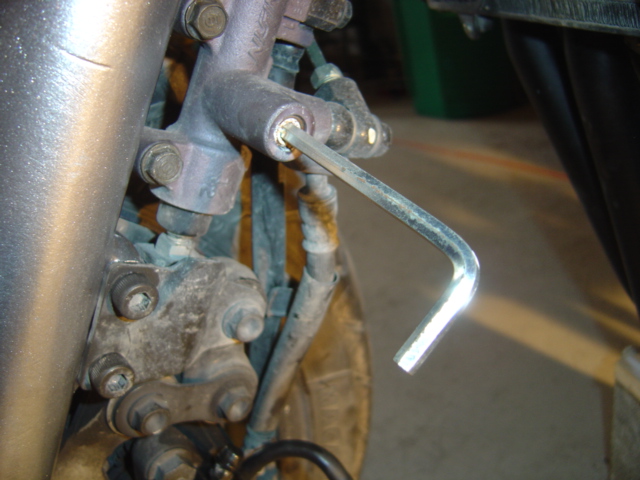 Vous remarquerez que sur le bras de fourche gauche, vous avez un maître cylindre ! Dessus il y a une petite pastille qu'il faut retirer et en dessous, se cache une tête de vis BTR. Avec une clé, vous la desserrez dans le sens inverse des aiguilles d'une montre jusqu'à venir en butée :