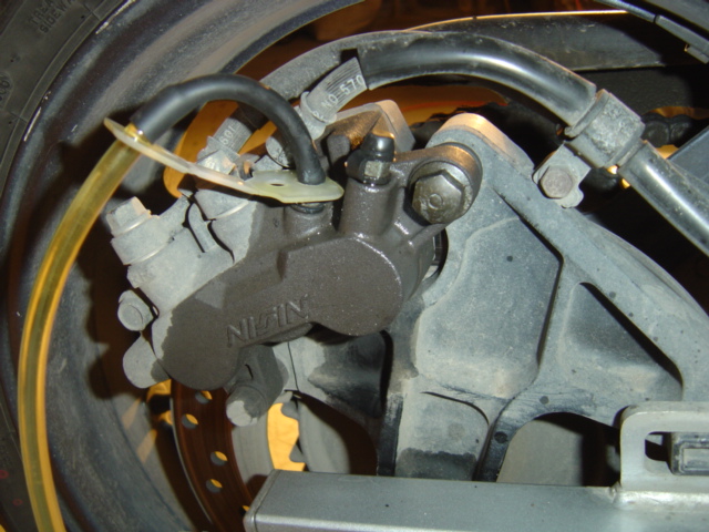 Remplissez au maximum le réservoir de frein arrière, appuyez lentement sur le levier de frein arrière et ouvrez le robinet de purge. Vous allez voir sortir le vieux liquide de freins foncé qui ce trouvait dans la liaison arrière / avant. Vérifiez le niveau du réservoir de frein arrière et le remplir avant que le niveau ne soit trop bas ceci toujours pour éviter les entrées d'air. Comme pour les autres manip précédente, au bout d'un certain temps vous allez voir sortir du liquide tout propre à travers le flexible, donc lors du dernier pompage, fermez le robinet de purge. Ensuite passez sur l'étrier gauche et toujours en pompant lentement sur le levier de frein arrière. Et pour finir l'étrier arrière.