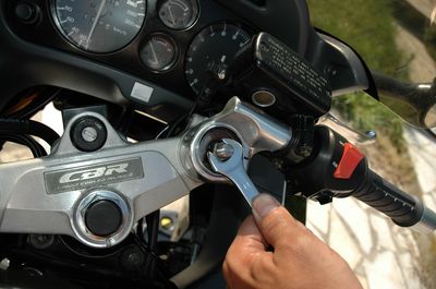 Placez la moto sur sa béquille centrale, puis repérer la vis de purge. Procédez un tube après l'autre sous peine de vilaine surprise.