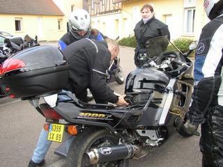 Tout d’abord DOUDOU qui a du mal à la faire démarrer mais y réussi quand même, ensuite le démontage de la selle du CBR de Kriko... car, dit-il, il faut enlever le tuyau d’arrivée d’essence et entendre un petit « pchiiittttt » qu’il imite très bien d’ailleurs...